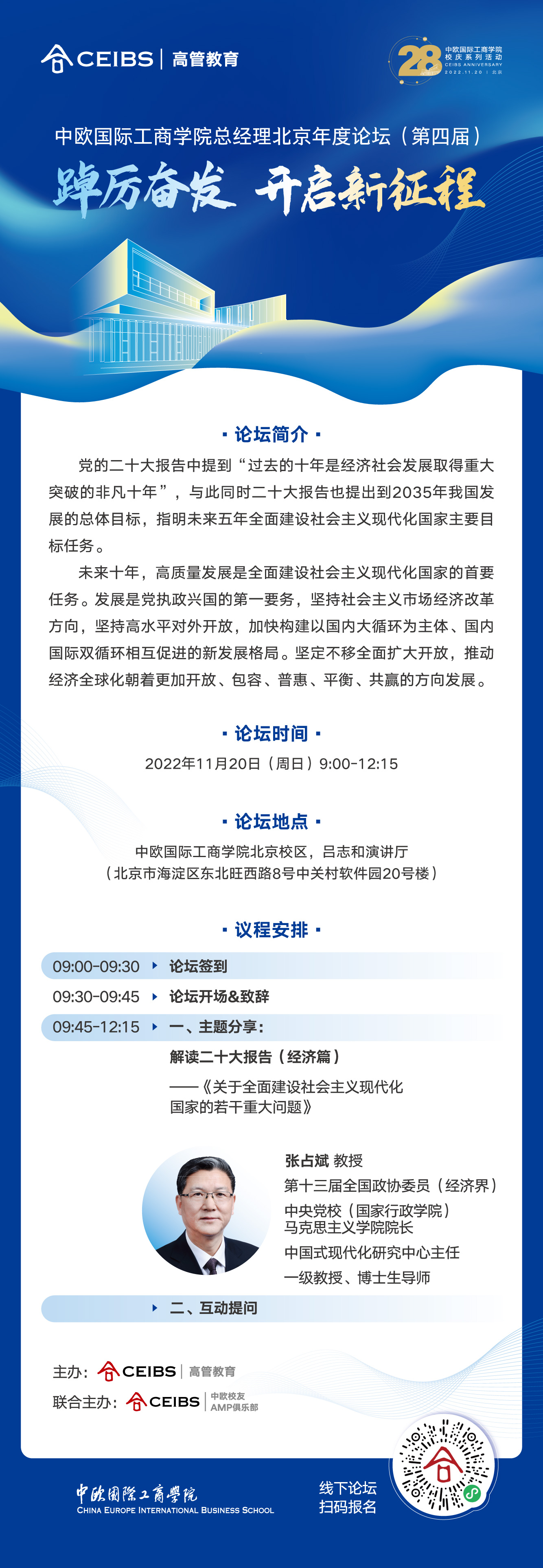 * 论坛费用:公开活动免费,席位有限,中欧PLUS小程序是唯一报名渠道,先到先得。如名额已满,可选择进入等待队列。如有空余席位,将按排队顺序递补。