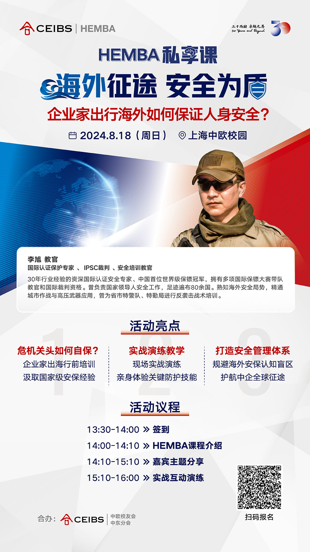 8月18日(星期日),HEMBA私享课特别邀请李旭教官——一位拥有30年行业经验的国际认证安全保护专家,为出海企业家、高管们带来一场全面的海外出行安全培训,提升个人安全防护的认知与能力。现场还将邀请IPSC认证射手RO、ISMOC认证射手、中国探险家协会射击分会理事瞿木郎子女士,一同进行实战演练,帮助大家掌握关键的安全防护技能。