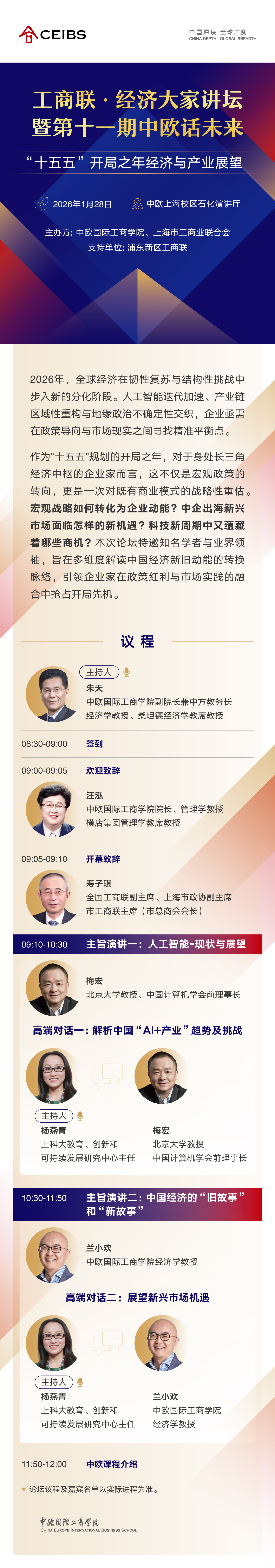 学院介绍 学院创办 院长致辞 里程碑 管理委员会 国际顾问委员会 公司顾问委员会 EMBA顾问委员会 认证排名 学院公告 公示和声明 招标中标公告 新闻中心 新闻动态 媒体聚焦 中欧故事 视频中心 中欧悦读 媒体联系人 关注我们 活动预告 中欧ESG 支持中欧 创始及永续会员 我要捐赠 捐赠项目 查阅年报 加入我们 联系我们 课程咨询 中欧建院30周年办学成果展 与你云端相见! 面包屑 首页 关于中欧 活动预告 2026年01月28日 工商联·经济大家讲坛暨第十一期中欧话未来 “十五五”开局之年经济与产业展望 后退 打印友好页面