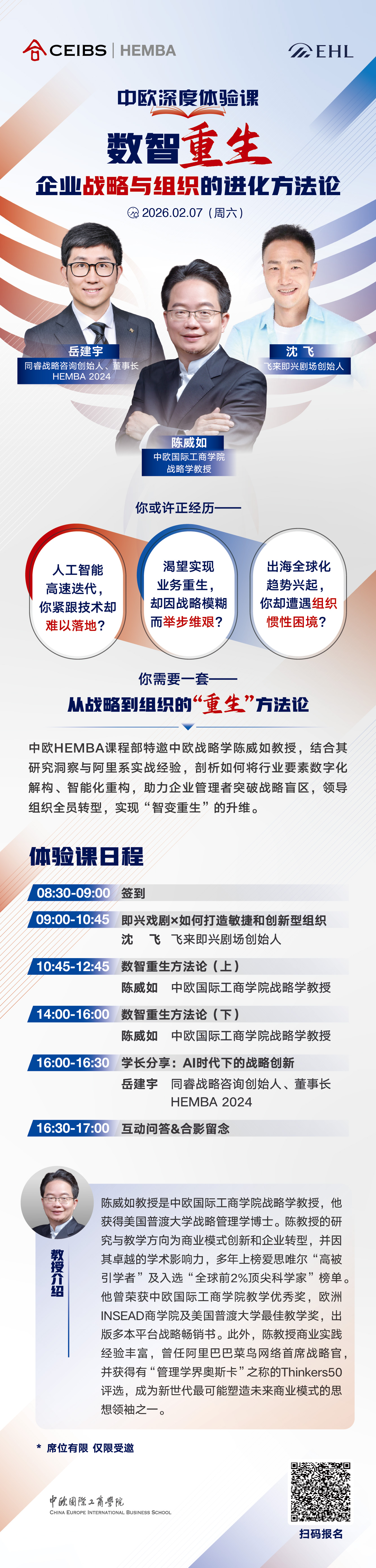 学院介绍 学院创办 院长致辞 里程碑 管理委员会 国际顾问委员会 公司顾问委员会 EMBA顾问委员会 认证排名 学院公告 公示和声明 招标中标公告 新闻中心 新闻动态 媒体聚焦 中欧故事 视频中心 中欧悦读 媒体联系人 关注我们 活动预告 中欧ESG 支持中欧 创始及永续会员 我要捐赠 捐赠项目 查阅年报 加入我们 联系我们 HEMBA课程咨询 欢迎您咨询中欧HEMBA课程。请您提供以下信息,我们的招生老师会尽快与您联系。 姓名 手机 邮箱 公司 职务 工作年限 最高学历 中欧校友 是 否 PrivacyPolicy 我已经阅读并同意隐私条款,同意通过本人提交的联系方式如电子邮件和电话接收中欧国际工商学院发送的课程信息和Newsletter等。我已知晓我拥有随时撤回同意的权利。 请同意隐私条款 我已经阅读并同意隐私条款,同意通过本人提交的联系方式如电子邮件和电话接收中欧国际工商学院发送的课程信息和Newsletter等。我已知晓我拥有随时撤回同意的权利。 Tracking code: 提交 我要咨询 申请流程 联系我们 我要咨询 欢迎您咨询中欧HEMBA课程。请您提供以下信息,我们的招生老师会尽快与您联系。 姓名 手机 邮箱 公司 职务 工作年限 最高学历 中欧校友 是 否 PrivacyPolicy 我已经阅读并同意隐私条款同意通过本人提交的联系方式如电子邮件和电话接收中欧国际工商学院发送的课程信息和Newsletter等。我已知晓我拥有随时撤回同意的权利。 请同意隐私条款 Tracking code: 提交 相关链接 走进卓越社群 报名热线:021-2890 5556 电子邮箱:hemba@ceibs.edu 面包屑 首页 关于中欧 活动预告 2026年02月07日 中欧HEMBA深度体验课:数智重生——企业战略与组织的进化方法论 后退 打印友好页面 2026级招生中 ▶▷立即报名